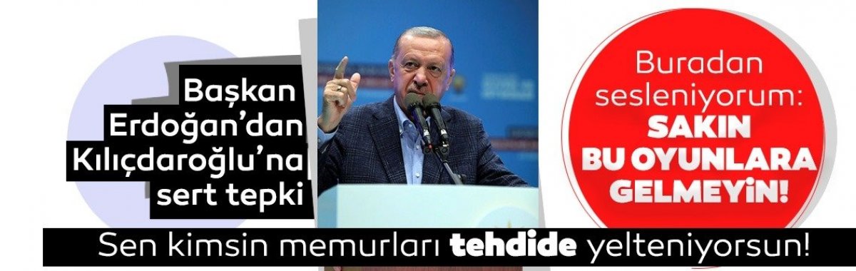 Eskişehirde AK Parti Genişletilmiş İl Danışma Toplantısında konuşan Başkan Erdoğan, CHP Genel Başkanı Kemal Kılıçdaroğlunun ülkemizin memur ve bürokratlarına yönelik skandal sözlerine çok sert tepki gösterdi. Erdoğan konuşmasında, "Kadrolu militanlarını öne sürerek yurtlar üzerinden üniversite gençliğimizi provoke ettiler, öğretmenleri tehdit ettiler. Sen kimsin de benim memurumu, polisimi, öğretmeni mi tehdide yelteniyorsun? Memurlarımıza sesleniyorum: Sakın ha bu oyunlara gelmeyin! Bunların hiçbirisi sizin kılınıza dokunamaz" ifadelerini kullandı.