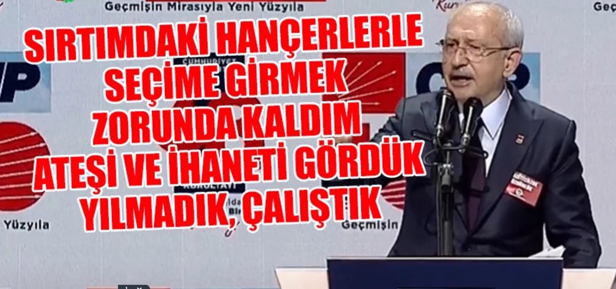 CHP 38. Olağan Kurultayı “İkinci Yüzyılda Demokrasi ve Birlik Kurultayı" sloganıyla bugün Ankara’da başladı. CHP Genel Başkanlığı için yeniden aday gösterilen Kemal Kılıçdaroğlu, kurultay açılışını yaptı. "Kimse kendisini partinin üzerinde göremez" diyen Kılıçdaroğlu, "Partinin yükünü taşıyanlar örgütlerdir." ifadelerini kullandı. Kılıçdaroğlu: Sırtımdaki hançerlerle seçime girmek zorunda kaldım. Ateşi ve ihaneti gördük, yılmadık, çalıştık. Beni asıl üzen sırtımdaki yük değil, hançerlerdir.